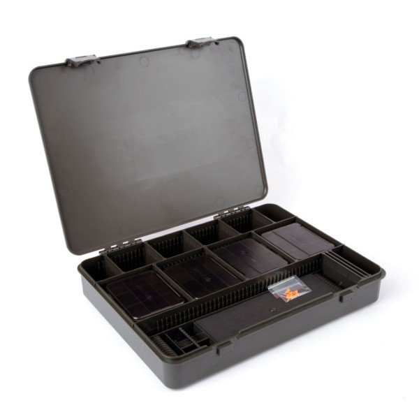 Eine Box für Angler, die gerne eine Vielzahl von Rig-Komponenten und Hakenlänge Materialien tragen. Die LOKBOX™ LARGE LOADED BOX wird komplett mit acht internen Aufbewahrungsboxen (siehe unten) geliefert, die jeweils Platz für Wirbel, Haken, Rig-Ringe, Perlen usw. bieten. Darüber hinaus gibt es eine doppelseitige Wicklung um Rig Board und 20 Rig Board Pins. Die perfekte Box für lange Reisen ins Ausland. Jede Box der LOKBOX™ Serie ist mit Click-Lok sicheren Verschlussklappen und Level-Lok Scharnieren ausgestattet, die sich um 180 Grad öffnen und verriegeln lassen.