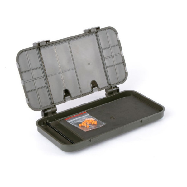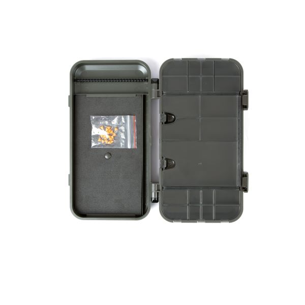 Die perfekte Lösung für den methodischen Angler, der gerne mit vorgefertigten Rigs und Komponenten vorbereitet wird. Der Deckel enthält 21 unterschiedlich große, schlanke Ablagefächer zur Aufnahme von Wirbeln, Haken, Perlen und anderen wichtigen Rig-Bindungskomponenten. Jede Box der LOKBOX™ Serie ist mit Click-Lok sicheren Verschlussklappen und Level-Lok Scharnieren ausgestattet, die sich um 180 Grad öffnen und verriegeln lassen. Lagerung für 25 Rigs und Lieferung mit 25 Rig Board Pins. Für Präzision gibt es ein 20cm Rig Lineal auf der Innenseite der Rig Box gestempelt. Schlank, robust und einfach zu verstauen.