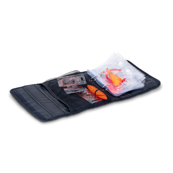 Die Uni Cat Rig Sleeve ist eine hochwertige Vorfachtasche die mit Klett sicher verschlossen werden kann. Verstauen Sie in den 10 Klarsichthüllen, die mit Druckknöpfen ausgestattet sind, Ihre fertigen Rigs, das Vorfachmaterial dazu in der gegenüberliegenden Netzablage. Die exklusive Honeycomb Black-Camou Optik macht es zugleich zu einem wahren Schmuckstück.